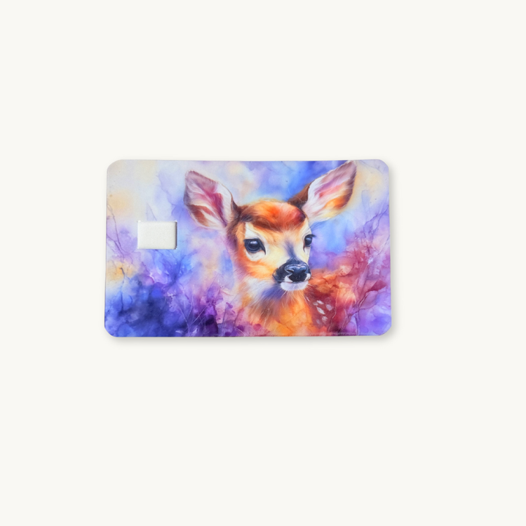 A little touch of woodland magic for your wallet. This gentle debit card skin features a beautiful watercolor illustration of a baby fawn with soft, doe-eyed innocence, set against a dreamy background of purple, blue, and orange hues. It’s a sweet, heartwarming addition to your everyday carry.